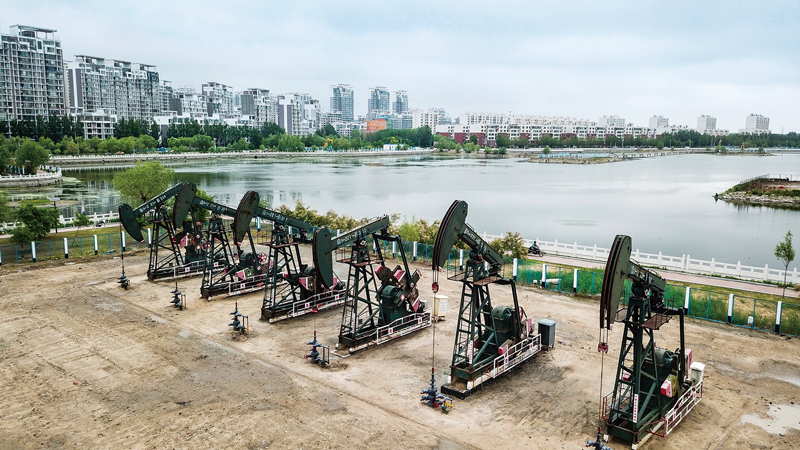經過半個多世紀艱苦創業,大慶油田不僅扛起了“共和國加油機”的神圣職責,為保障國家能源安全作出巨大貢獻,而且著力打造了一座人與自然和諧相處、原油生產與環境保護相得益彰的“綠色油化之都”。圖為大慶油田叢式井坐落在市區燕都湖旁。 新華社記者 王建威/攝